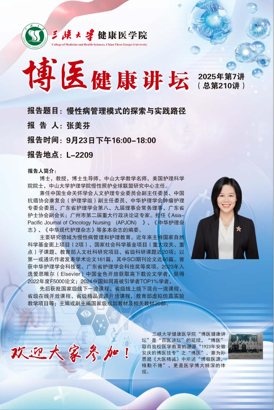博医健康讲坛第210讲报告题目:慢性病管理模式的探索与实践路径报告时间:9.23(周二) 16:00——18:00报告地点:理科楼L-2209报告人:张美芬 教授